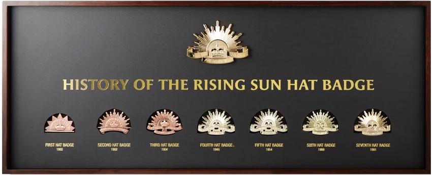 The History of the Rising Sun Hat Badge Collection is Australia's premier collection of high-quality reproductions of all seven variations of the Rising Sun badges proudly worn by generations of soldiers since 1902. Since its inception as a general service badge for the Australian contingents serving in the Boer War, the Rising Sun badge has undergone seven iterations.