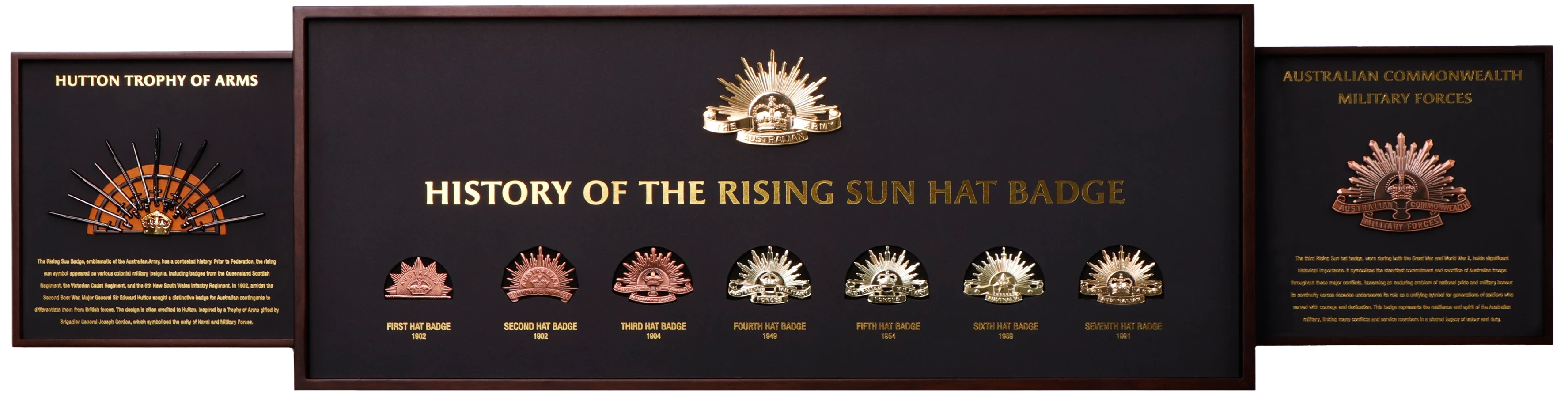 What sets this frame apart are the innovative push-to-open compartments on each side, each revealing a remarkable piece of history. On the left, a finely crafted replica of the Hutton Trophy of Arms takes pride of place—marking the first time in Australian history that this prestigious trophy has been made available to the public. On the right, the second compartment unveils an oversized metal rendition of the third iteration of the Rising Sun Badge. Worn by Australian soldiers throughout both the Great War and World War II, this iconic emblem carries profound historical significance.